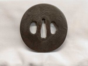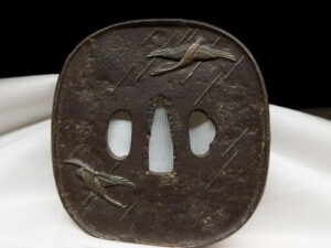 Tsuba della scuola Higo del periodo Edo, primi del 1700, realizzata in ferro con decorazioni in sukashi. Maru gata, maru mimi, vi sono raffigurati due aironi in un elegante sukashi. Higo, antico nome dell'attuale provincia di Kumamoto, è nota per ...