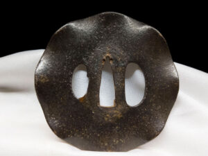 Tsuba in ferro del periodo Edo. Maru gata con kaku mimi con una bella complessità del metallo ha una bordo lavorato con ondulazione regolare che la rende unica ome oggetto (kanji): 鍔Nome oggetto (romaji): TsubaEpoca : Periodo EdoDimensioni: 8,3cm x ...