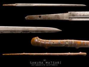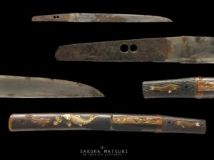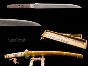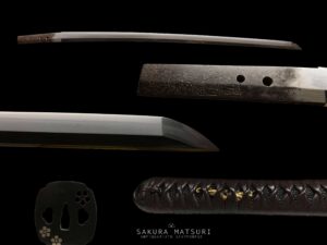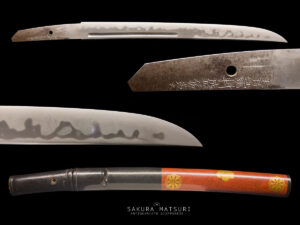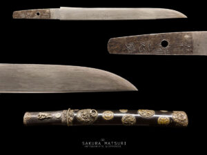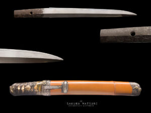 Tanto del primo periodo Muromachi, inizio XV secolo, con sugata hira zukuri montato in koshirae e certificato NBTHK. La hada è mokume mista a itame con tratti di masame in prossimità dello ha con l'aspetto di uzumaki. Lo hamon è ...