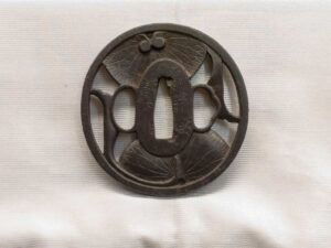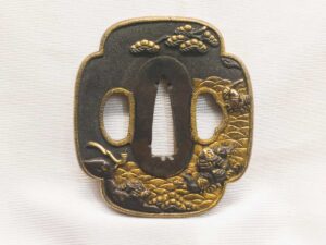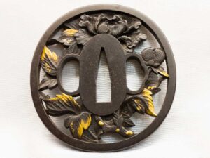 Tsuba della scuola Bushu in sukashi del periodo Edo a tema peonie. Realizzata in ferro con decorazioni in oro, maru gata, maru mimi. L'elegante rappresentazione delle peonie è arricchita dalla doratura delle foglie con raffinata tecnica di sfumatura. L'applicazione dell'oro ...