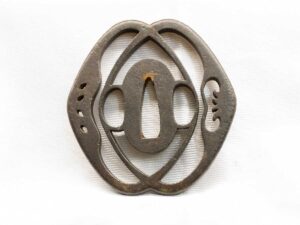 Tsuba del tardo periodo Edo in stile Higo della scuola Kamiyoshi. Realizzata in ferro con motivi in sukashi, ryo mokko gata, maru mini. Le realizzazioni in sukashi sono di tipo geometrico, da notare che le decorazioni esterne sono rette interamente ...