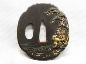 Tsuba del periodo Edo realizzata in ferro con dettagli in oro. Naga maru gata, raffigurante due koma inu, guardiani dei templi shintoisti, in lotta. Tsuba molto imponente, con dettagli forti ed espressivi, ha certamente un posto fra i lavori originali ...