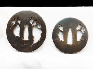 Coppia di tsuba per daisho del periodo Meiji/Taisho, realizzata in acciaio patinato con decorazioni in sukashi. Maru gata, maru mimi, le decorazioni in sukashi sono decise ed eleganti e rappresentano un gruppo di uccelli sui rami di un albero. La ...
