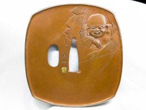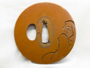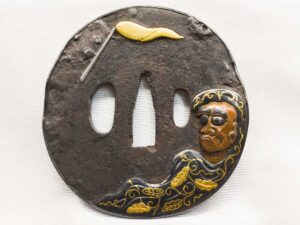 Tsuba del periodo Edo, inizi del 1700, realizzata in shibuichi con decorazioni a cesello firmata Somin della scuola Yokoya. Maru gata, kaku mimi, realizzatta in shibuichi vièraffigurato un saggio, forse il Dharma, con i tratti caratteristici della mano di Somin ...