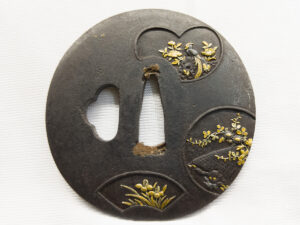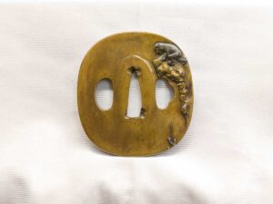Tsuba del periodo Edo, tardo 1700, realizzata in ferro con dettagli in shakudo, shibuichi, argento e oro. Maru gata, kaku mimi, questa tsuba della tradizione Hamano è realizzata contrastando la superficie volutamente grezza con i dettagli accurati dei soggetti. Sul ...
