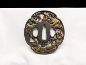 Tsuba del periodo Edo, a cavallo fra 1700 e 1800, in ferro raffigurante saggi in stile tradizionale. Tsuba mokko gata, kaku mimi, in ferro con decorazioni in rame e oro della tradizione Soten. Vi sono raffigurati un gruppo di saggi ...