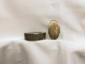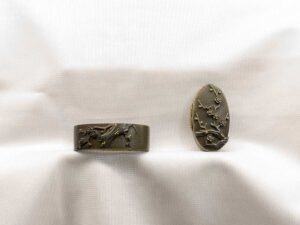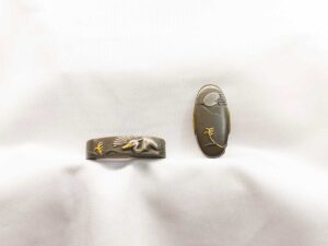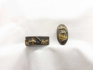 Fuchi e kashira realizzati in shibuichi con dettagli in shakudo e oro. Su questa coppia di fuchi e kashira vi è rappresentato un susino in fiore, con rami in shakudo adornati da agemine in oro. Il susino, ume, è uno ...