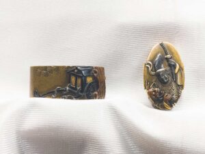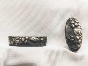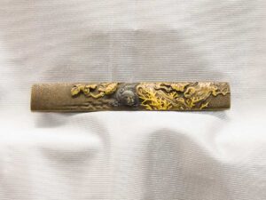 Fuchi e kashira realizzati in shibuichi con dettagli in oro, argento e shakudo del tardo periodo Edo. La rappresentazione di questa coppia di fuchi e kashira risulta originale grazie all'accostamento della magistrale lavorazione della superficie dello shibuichi all'interpretazione moderna delle ...