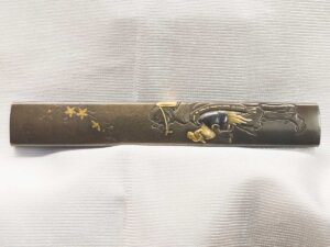 Kozuka del periodo Edo, XIX secolo, a firma 元儔 Mototomo. Finemente lavorato è realizzato in shibuichi con decorazioni in shakudo e oro e dettagli lavorati a cesello. Il kozuka raffigura un saggio con in mano un gallo intento ad osservare ...