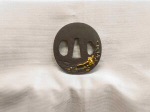 Tsuba del periodo Edo, tardo 1700, realizzata in ferro con dettagli in oro. Nagamaru gata, dote mimi, le decorazioni presenti nella tsuba sono una rappresentazione della nebbia che si leva al mattino mediante strature dorate. Nome oggetto (kanji): 鍔Nome oggetto ...