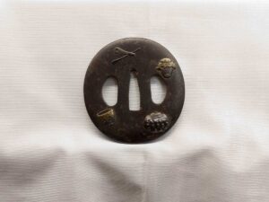 Tsuba del periodo Edo, tardo 1700, realizzata in ferro con dettagli in oro, rame e shakudo. Maru gata, maru mimi, sono qui raffigurati gli strumenti per il chanoyu, la cerimonia del tè giapponese, dove sono ben visibili teiera, chawan (tazza), ...