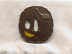 Tsuba del periodo edo realizzata in ferro con decorazioni in argento, oro e shakudo. Kawari gata, sukidashi maru mimi, sul lato omote è raffigurata un'oca in argento in volo con il sole nascosto tra le nuvole, mentre sul lato ura ...