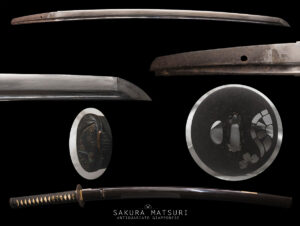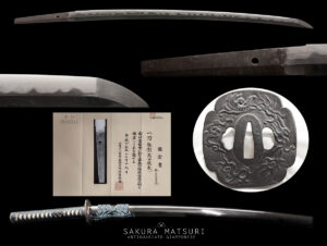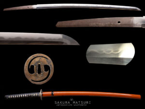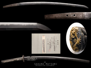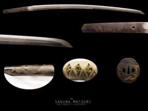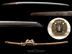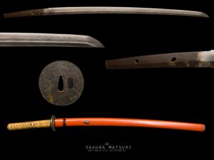 Katana risalente al periodo Edo, montata in koshirae buke tsukuri, in stile Osaka Shinto. La hada è mokume misto a itame, appariscente e ben forgiato. Lo hamon è notare midare misto a suguha che diviene più ampio nell'area del monouchi ...
