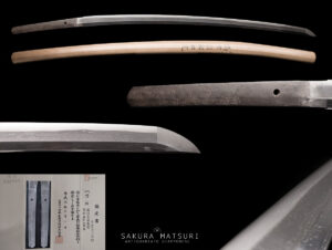 Katana del periodo Muromachi, Koto, montata in shirasaya con sayagaki. Sugata shinogi zukuri, torii zori, iori mune. La hada è itame mista a mokume, nagare, o hada. Lo hamon è suguha in nioi deki, con chikei e nie kuzure. Il ...