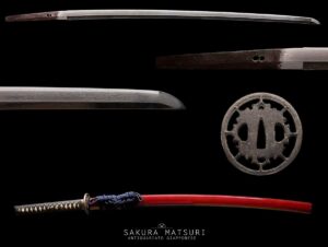 Katana del periodo medio Muromachi, Koto, montata in koshirae buke tsukuri in lacca rossa. Sugata shinogi zukuri, torii zori, iori mune. La hada è itame mista a mokume e ben forgiata. Lo hamon è gunome choji midare in nie e ...