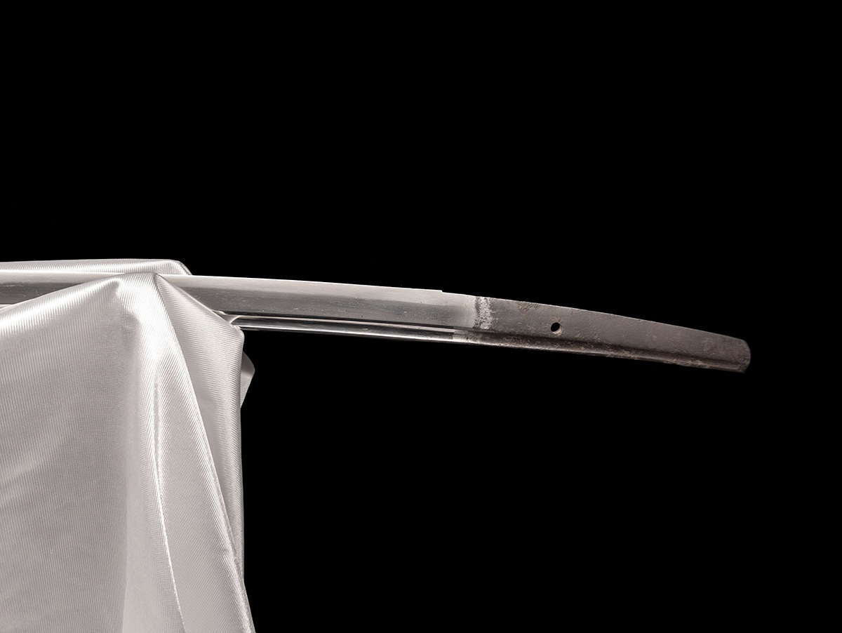Katana del periodo Nanbokucho, primo Muromachi, con sugata shinogi zukuri, funbari, iori mune e torii zori tendente al koshi zori e bo hi. La hada è itame nagare con tratti di masame. Lo hamon è suguha in ko nioi deki, con uchinoke e nie kuzure e bo utsuri. Il boshi è suguha con kaeri medio. Il nakago o suriage, con un mekugi ana ed un mekugi ana, più antico, coperto, kurijiri nakagojiri, o suriage mumei. La lama presenta un bo hi attualmente kaki nagashi per via del suriage.