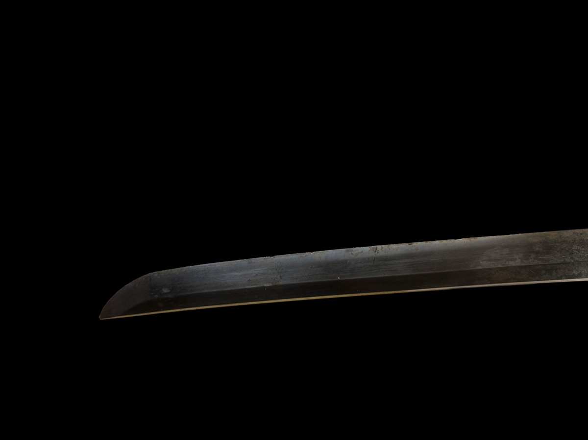 Firmata Sukezane saku kore. Sugata tendente al Koshi zori, iori mune con chu kissaki. La hada è un itame molto compatto e regolare. Lo hamon è chu suguha in un brillante nioi deki, molto regolare. Il boshi è suguha ko maru, con kaeri medio. Il nakago è ubu, 1 mekugi ana, ha agari kurijiri nakagojiri, con kiri yasurime. La lama è montata in koshirae buke tsukuri, con tsuba di tipo Nanban a tema fenice e dragone. Fuchi e kashira sono della scuola Goto a tema peonia decorati in argento e oro. La katana, come visibile in foto, necessita di un intervento di restauro. E’ stata valutata dal nostro politore come completamente restaurabile. Anche il koshirae necessita di intervento, deve essere restaurata la saya e rifatto lo tsuka maki. I menuki sono mancanti. Il prezzo finale tiene conto delle condizioni ed è stato decurtato del valore degli interventi necessari. La struttura della katana è solida, avendo ricevuto poche politure in passato, e rappresenta un’ottima possibilità di investimento.