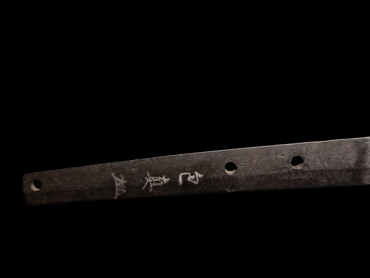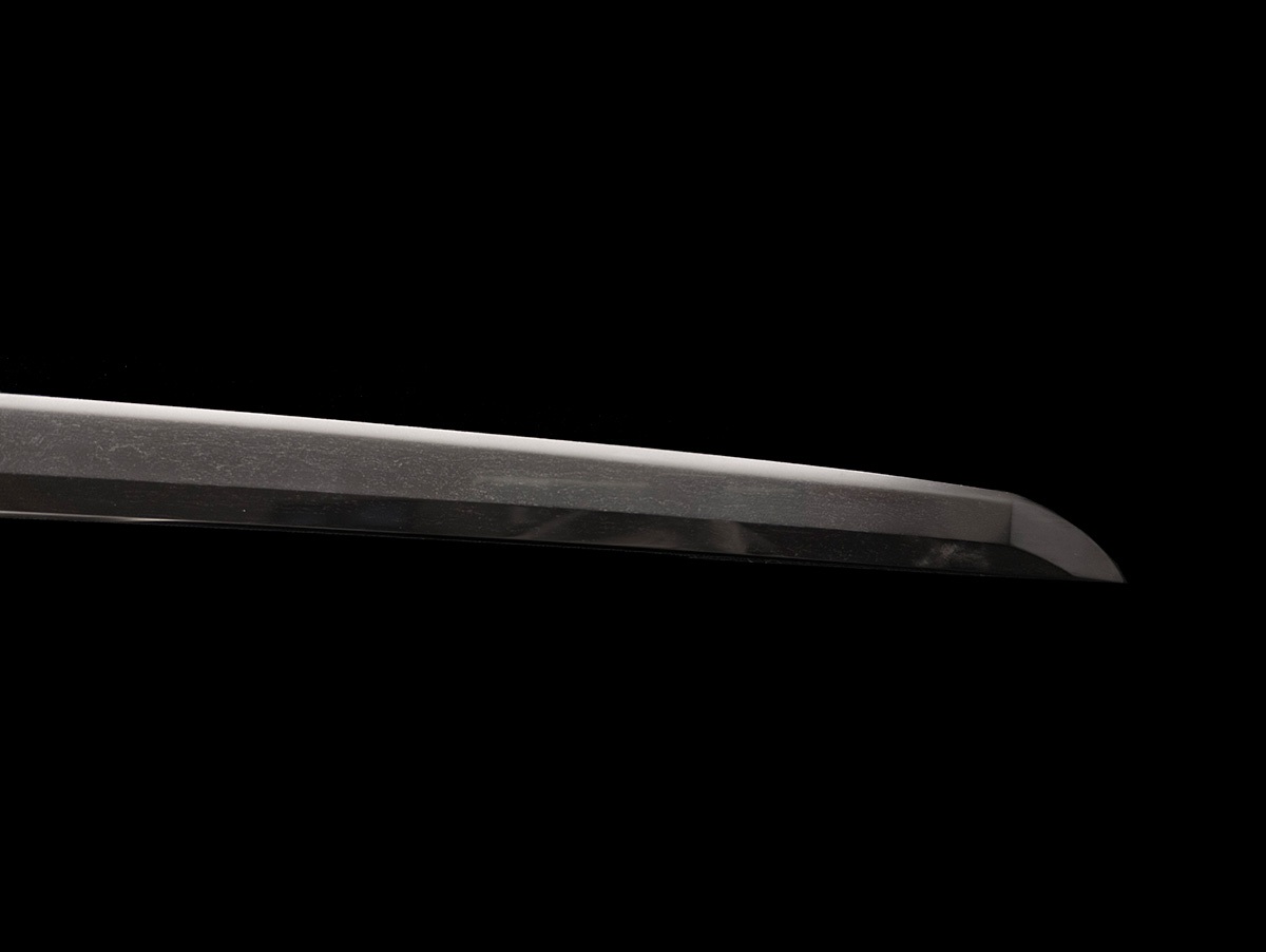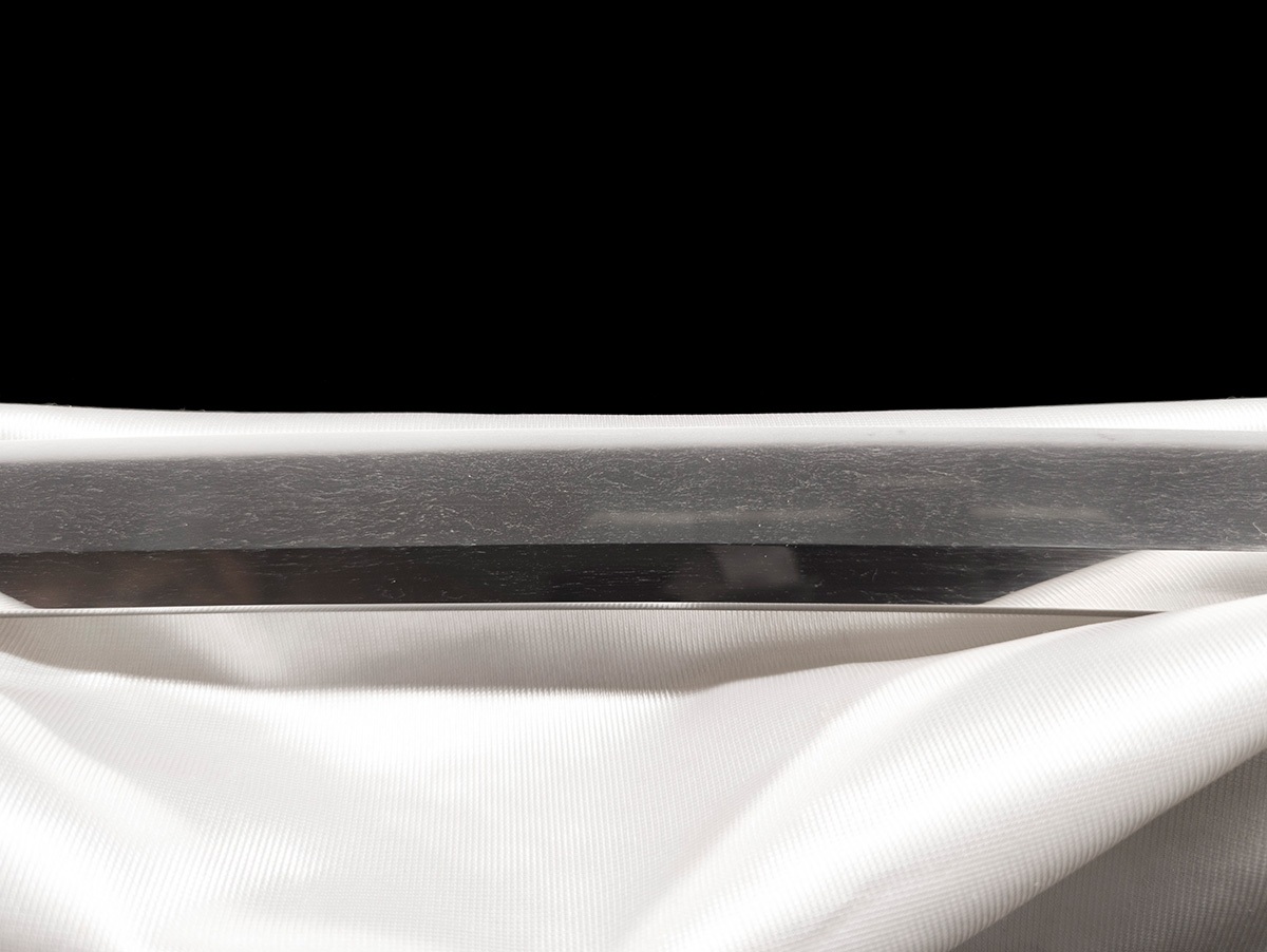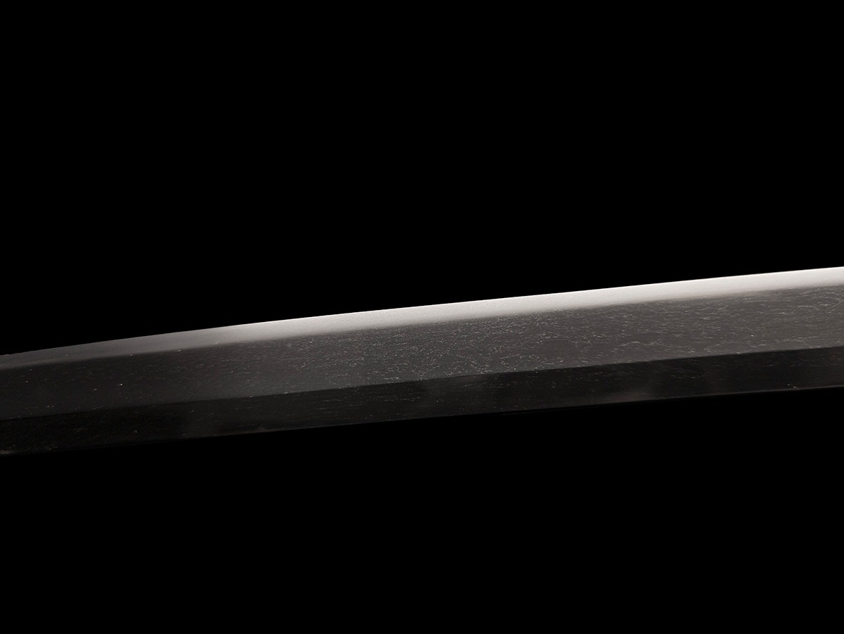 Katana del periodo Muromachi, tardo XIV secolo, Koto, firmata 包真 – Kanezane in ginzogan, scuola Sue Tegai, tradizione Yamato, con certificato NBTHK. Sugata shinogi zukuri, iori mune, koshi zori. Hada ko itame, compatta e variegata con tratti di nagare. Hamon ko suguha con presenza di hotsure, uchinoke, yubashira, inazuma, kinsuji e nijuba. Boshi ko suguha, con kaeri breve e regolare. Nakago o suriage, 3 mekugi ana, con firma in gin zogan cesellata in argento realizzata da Hon’ ami Ringa con mon. Montatura koshirae buke tsukuri, saya decorata con dragone in basso rilievo in prossimità del kojiri, possente tsuba in ferro della scuola scuola Ko Tosho con decorazioni tipiche della tradizione, fuchi e kashira della scuola Goto, in shakudo, raffigurante ciliegi in fiore ornati da agemine in oro su base finita a puntinatura. I menuki, anch’essi della scuola Goto, a tema floreale, in shakudo, decorati in oro, habaki in argento doppio strato. La shirasaya presenta sayagaki realizzato anch’esso da Hon’ami Ringa.