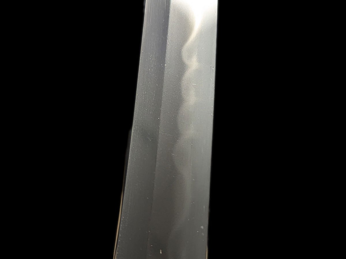 Katana del periodo Edo, Shinshinto, a firma Ozaki Gengoemon Suketaka. Sugata shinogi zukuri, torii zori, chu kissaki. La hada è un ko mokume estremamente fine e brillante. Lo hamon è gunome midare con evidenti linee di ko nie che creano un disegno di onde marine, con sunagashi e ashi. Il boshi è o maru, mu kaeri. Il nakago è ubu, un mekugi ana, iriyamagata nakagojiri e kesho yasuri. La lama è montata in koshirae buke tsukuri, con saya laccata in rosso, possente tsuba a tema futatsu domoe in sukashi realizzata in sentoku. Fuchi e kashira raffigurano scene legate ai templi shintoisti mentre i menuki sono a tema sode.