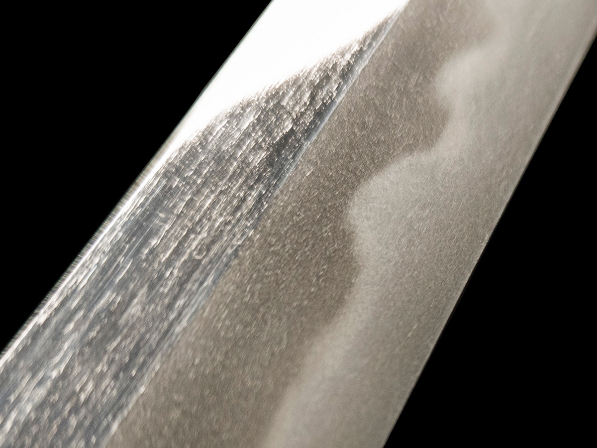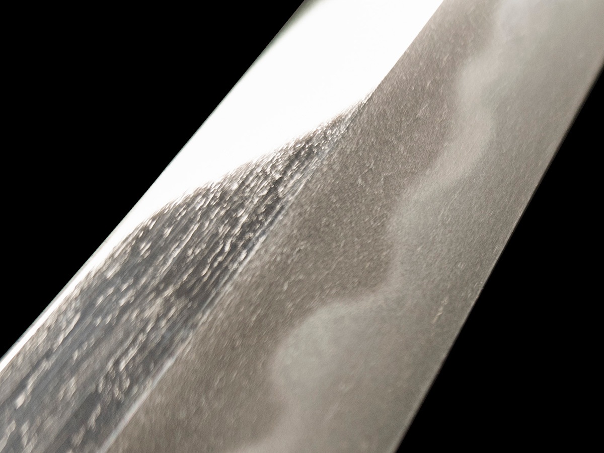 | Nome oggetto (kanji): 脇差 Nome oggetto (romaji): Wakizashi Epoca: Medio Edo, Shinto Nagasa: 53,1 cm Sori: 0,9 cm Moto-haba: 3,0 cm Saki-haba: 1,9 cm Moto-kasane: 0,6 cm Saki-kasane: 0,4 cm Montatura: shirasaya |
