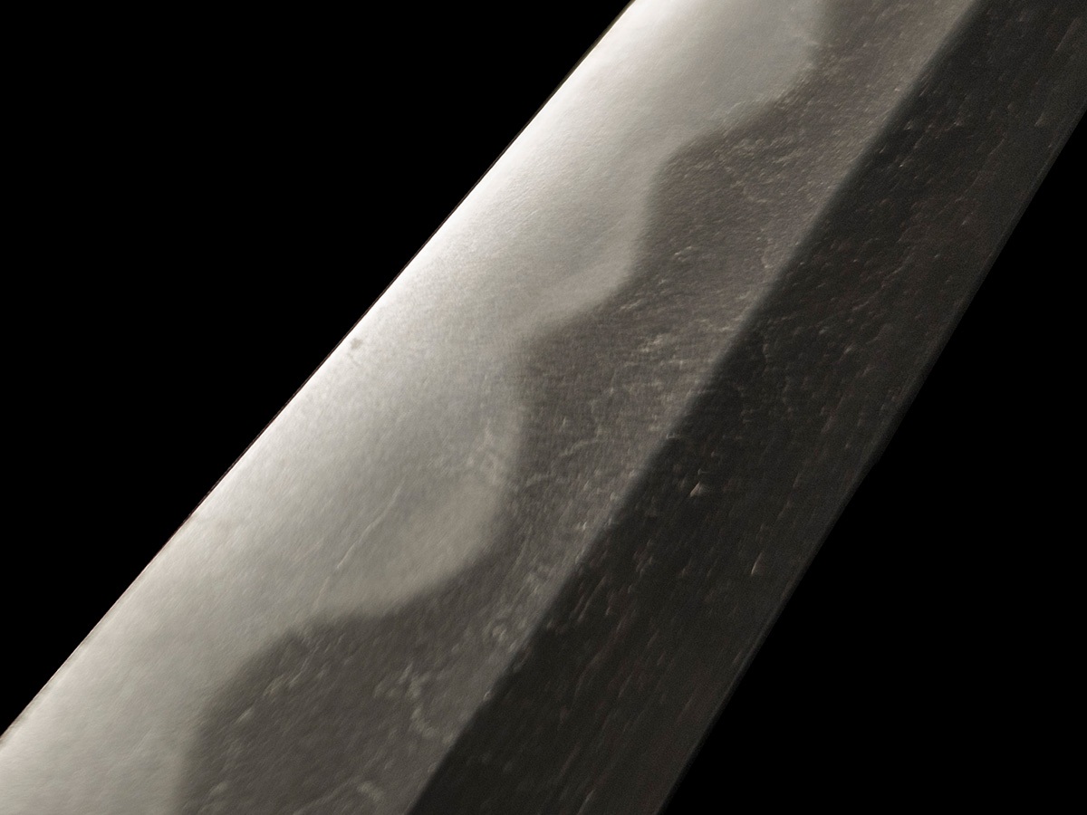 Wakizashi del medio periodo Edo, tardo Shinto, della scuola Mizuta montato in shirasaya. Sugata shinogi zukuri, iori mune, koshi zori. La hada è un mokume mista a itame, molto sottile e compatta. Lo hamon è gunome choji midare in nioi e ko nie deki, con nie kuzure, nie sake e ashi. Il boshi è suguha ko maru, kaeri fukai. Il nakago è o suriage mumei, 2 mekugi ana, ichimonji nakagojiri.
