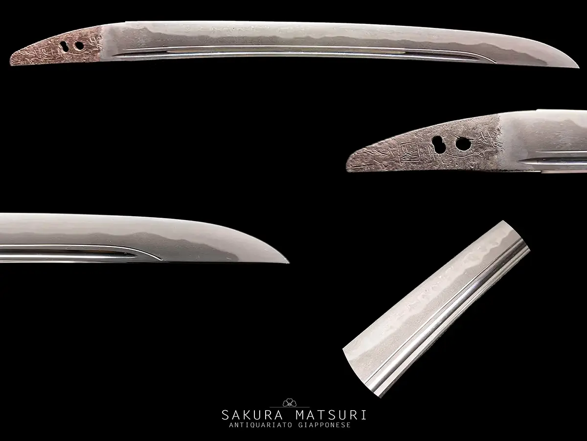 Tanto sunnobi del periodo Nanbokucho, XIV secolo, firmato Chikushu ju Kunihiro con sugata hira zukuri e horimono bo hi con soe bi. La hada è un itame misto a mokume e masame compatta e ben forgiata. Lo hamon è un potente gunome choji midare con sunagashi, kinsuji e inazuma. Il boshi è midare komi con kaeri yoru. Il nakago è ubu, con due mekugi ana, ha agari kurijiri nakagojiri. Sul lato omote è presente la mei Chikushu ju Kunihiro saku 筑州住國弘作 mentre sul lato ura è riportata la data Shohei ju O nen go gatsu hi 正平十O年正月日 (quinto mese del decimo[+] anno dell’era Shohei), dove il secondo ideogramma dell’anno risulta mancante a causa del mekugi ana, facendolo quindi risalire al 1357 ca.