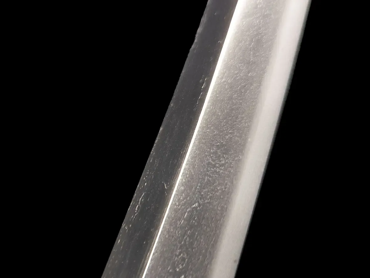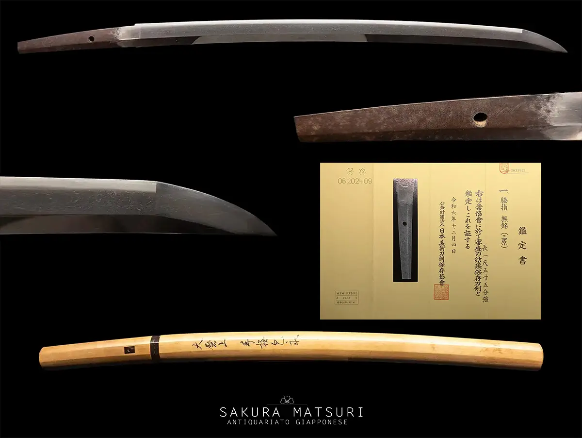 Wakizashi del medio periodo Muromachi, XV secolo, attribuito alla scuola Mihara con certificato NBTHK. Sugata shinogi zukuri, iori mune, torii zori tendente al koshi zori, o kissaki. Hada mokume e di ko mokume, compatta, con tracce di nagare a tratti tendente al masame. Hamon suguha regolare per tutta la sua lunghezza, molto appariscente, con nioi deki molto brillanti. Il boshi è suguha, ko maru, con kaeri breve. Nakago suriage, 1 mekugi ana, ichimonji nakagojiri. Il wakizashi è accompagnato da certificato NHTHK con attribuzione alla scuola Mihara. La lama è montata in shirasaya con attribuzione o suriage Tegai Kanenaga
