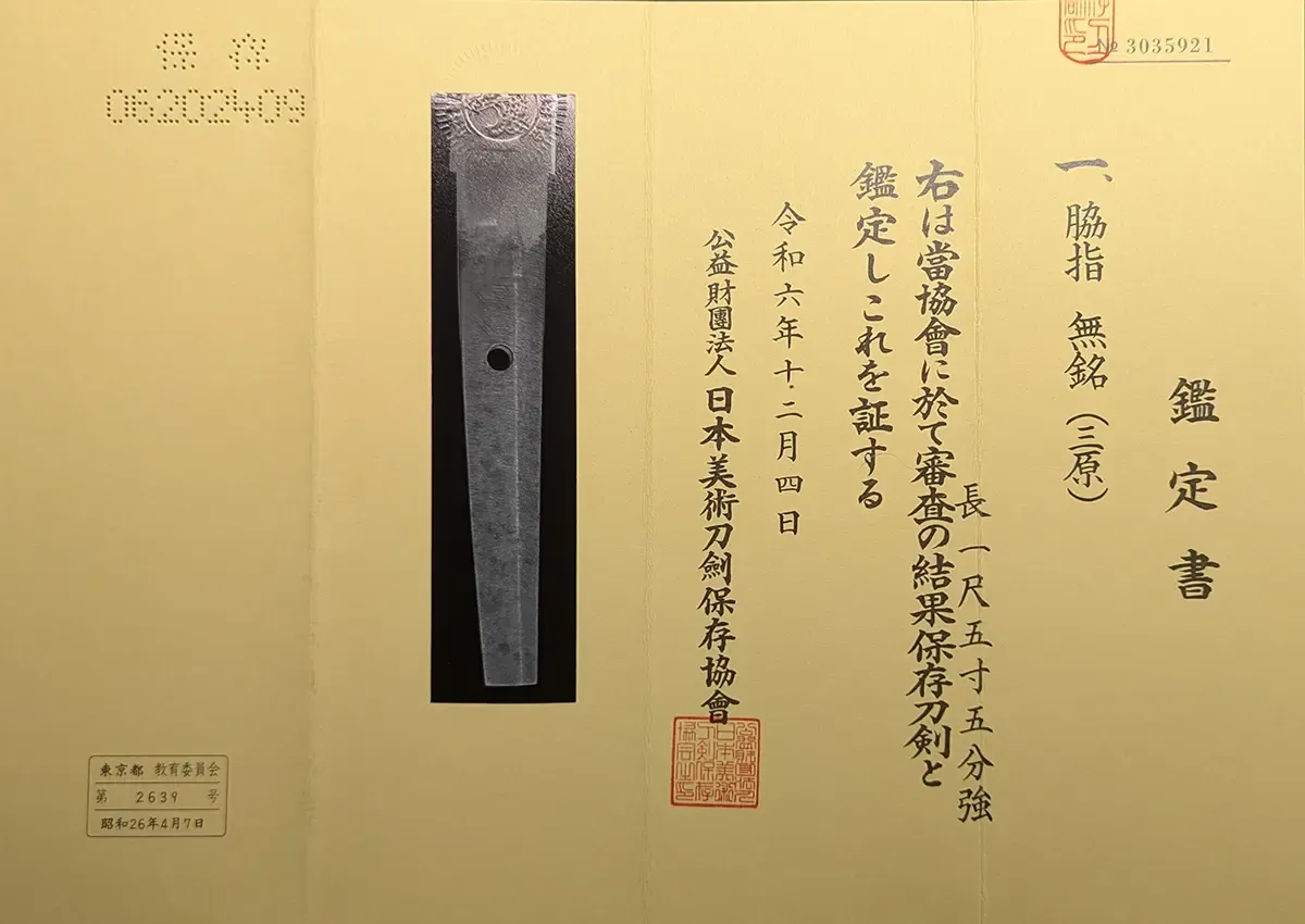 | Nome oggetto (kanji): 脇差 Nome oggetto (romaji): Wakizashi Epoca: Muromachi, 1400 Nagasa: 47,2 cm Sori: 1,1 cm Moto-haba: 2,6 cm Saki-haba: 2,1 cm Moto-kasane: 0,5 cm Saki-kasane: 0,4 cm Montatura: Shirasaya con sayagaki 大磨上 手掻包永 o suriage Tegai Kanenaga |