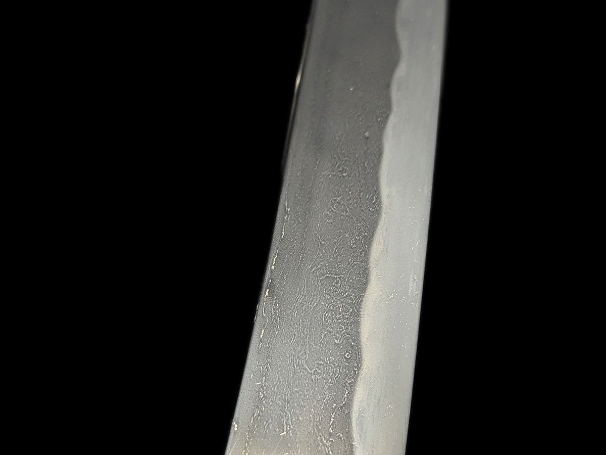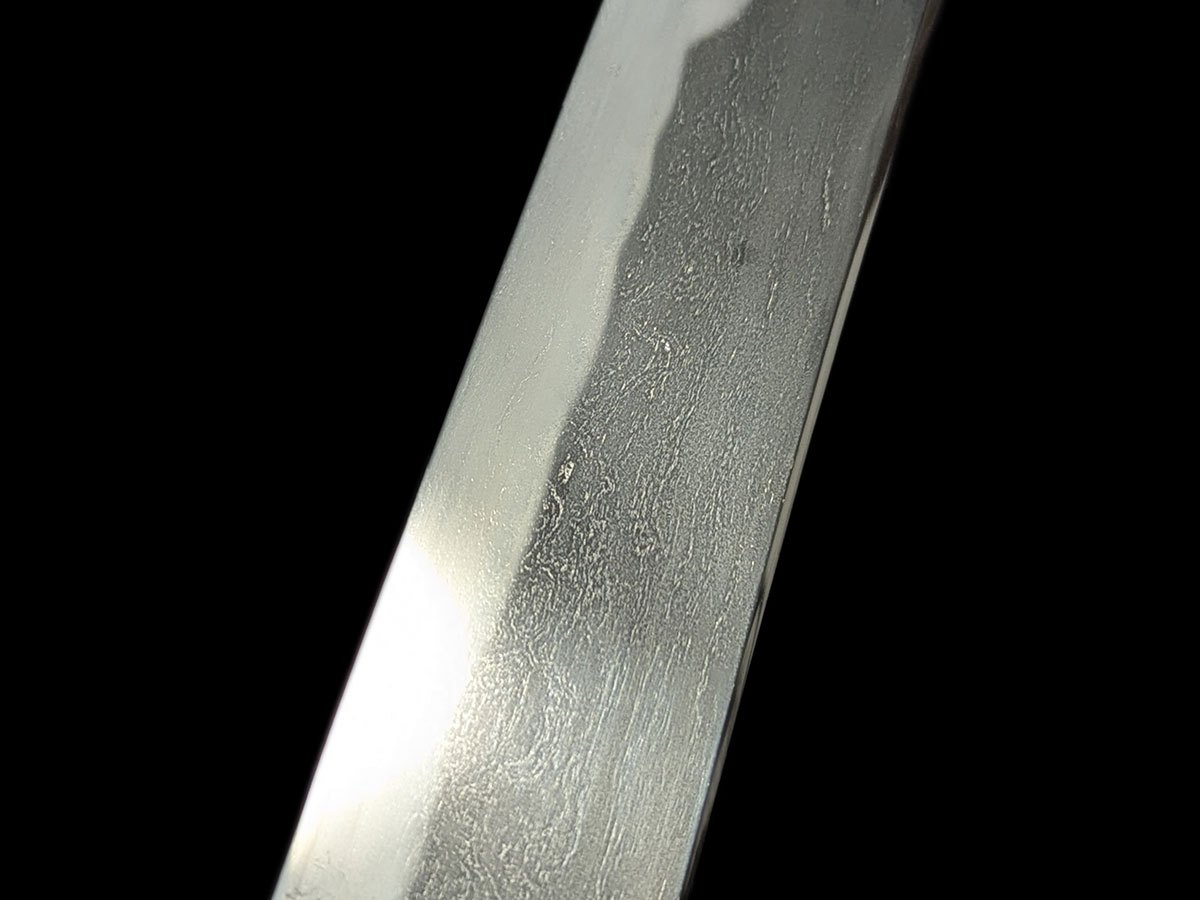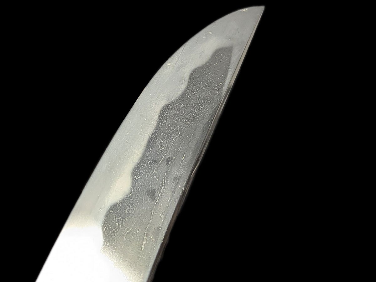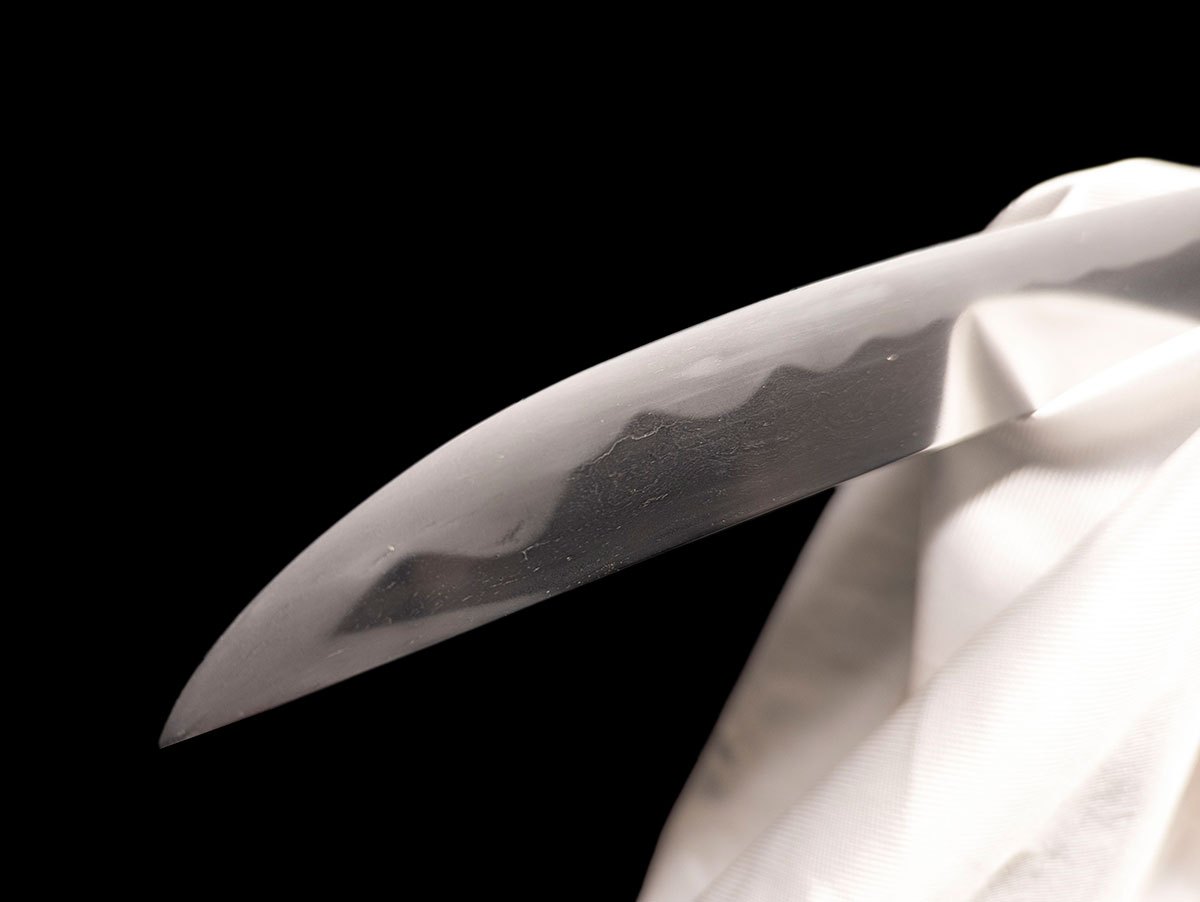 | Nome oggetto (kanji): 脇差 Nome oggetto (romaji): Wakizashi Epoca: Muromachi, Koto Nagasa: 50,0 cm Sori: 1,8 cm Moto-haba: 3,0 cm Saki-haba: 2,5 cm Moto-kasane: 0,6 cm Saki-kasane: 0,5 cm Mei: 兼法作 – Kanenori saku Montatura: shirasaya Fascia di prezzo: €2000-5000 |