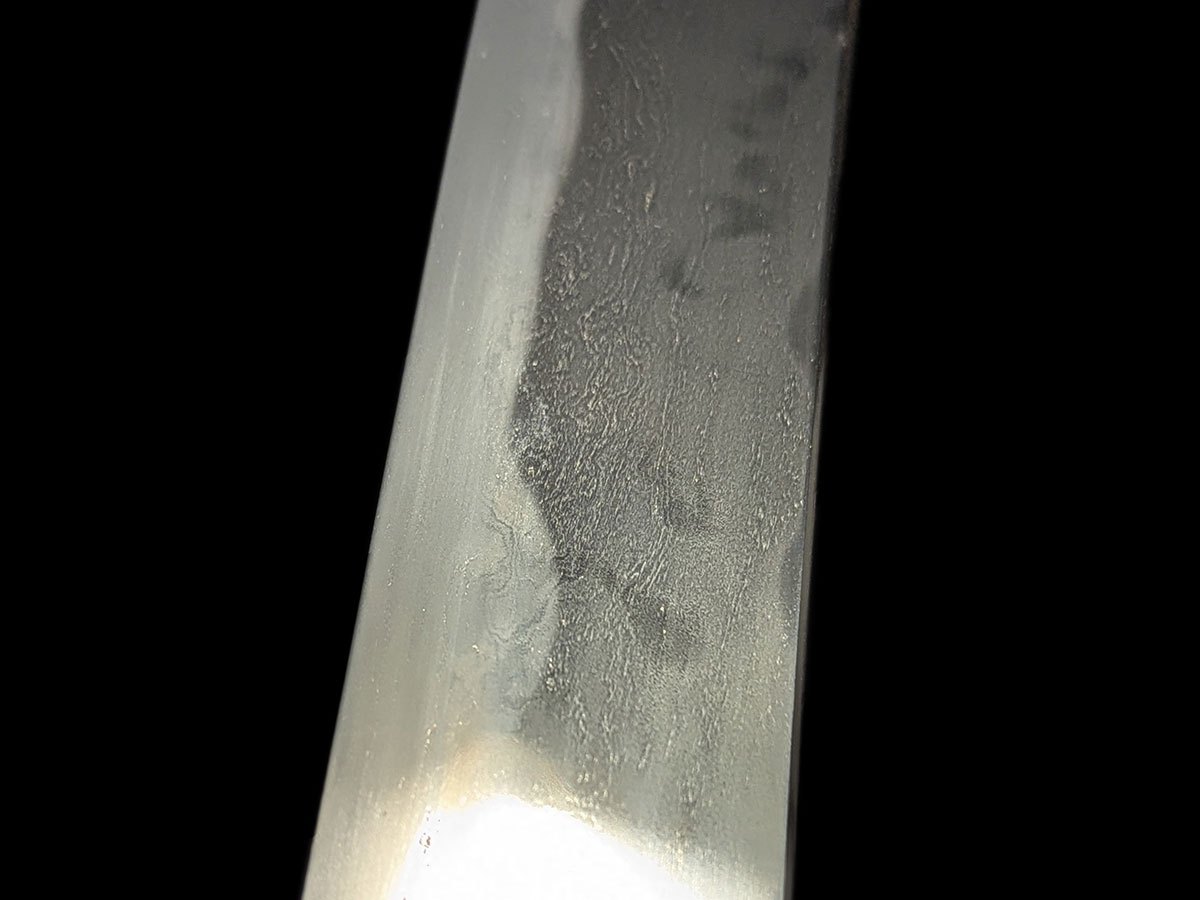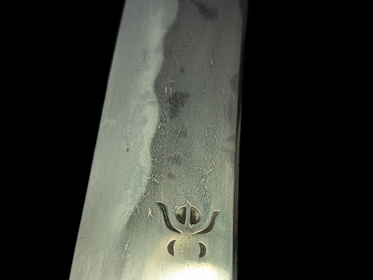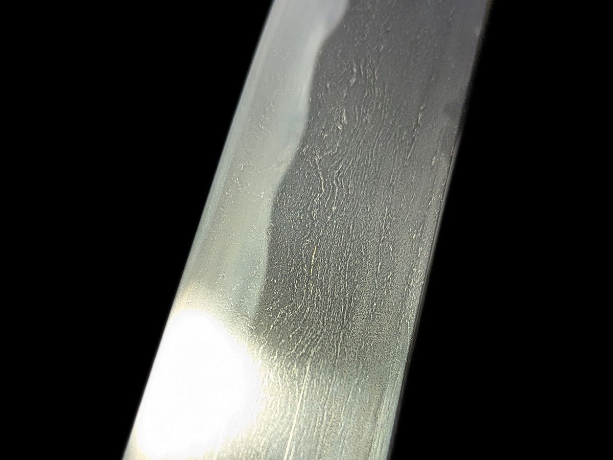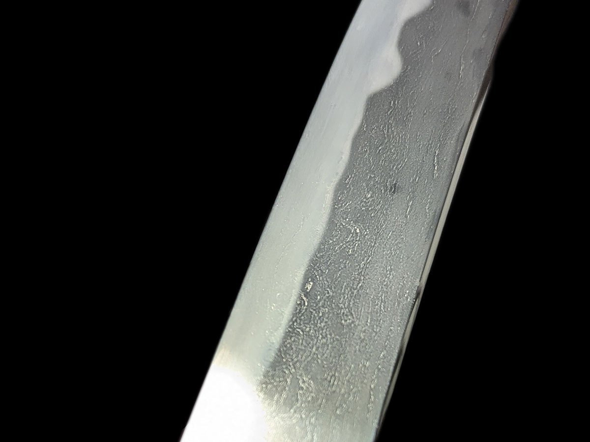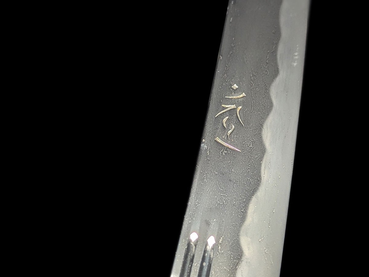 | Nome oggetto (kanji): 脇差 Nome oggetto (romaji): Wakizashi Epoca: Muromachi, Koto Nagasa: 50,0 cm Sori: 1,8 cm Moto-haba: 3,0 cm Saki-haba: 2,5 cm Moto-kasane: 0,6 cm Saki-kasane: 0,5 cm Mei: 兼法作 – Kanenori saku Montatura: shirasaya Fascia di prezzo: €2000-5000 |