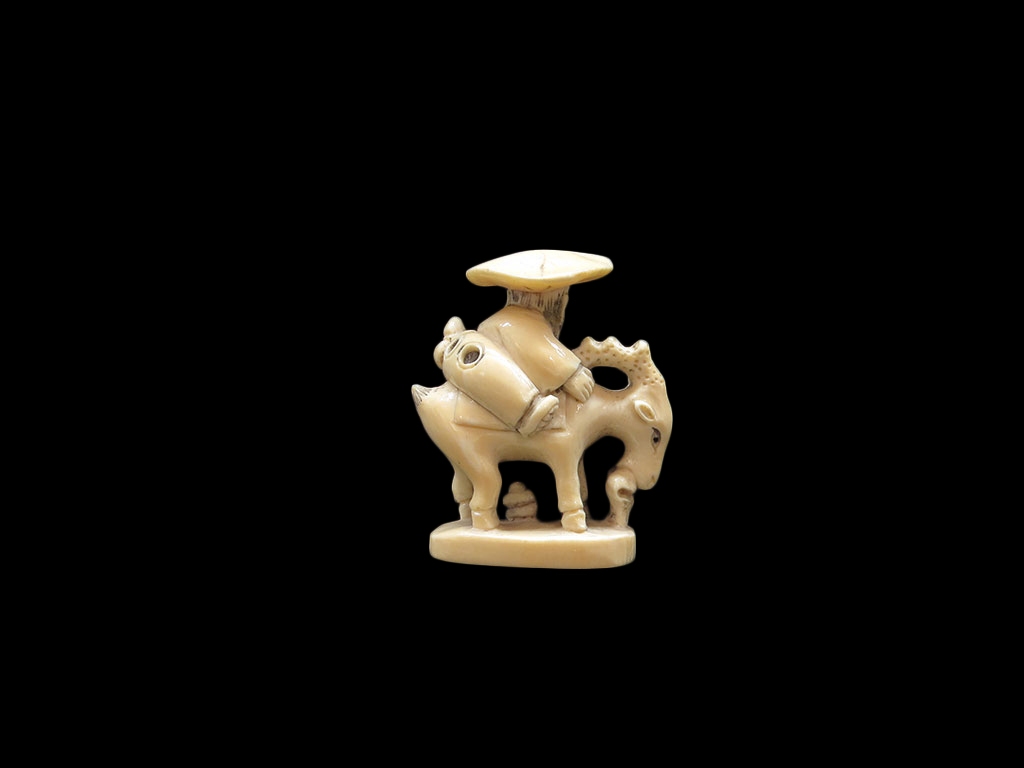 Netsuke molto particolare raffigurante una figura con cappello a cavallo di una capra, questa intenta a nutrirsi. Dai dettagli semplici e molto ben fatti, particolari decisi e raffinati