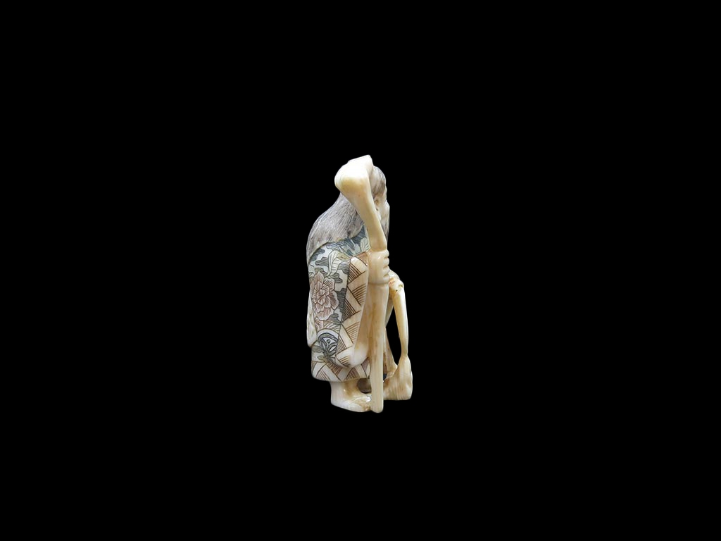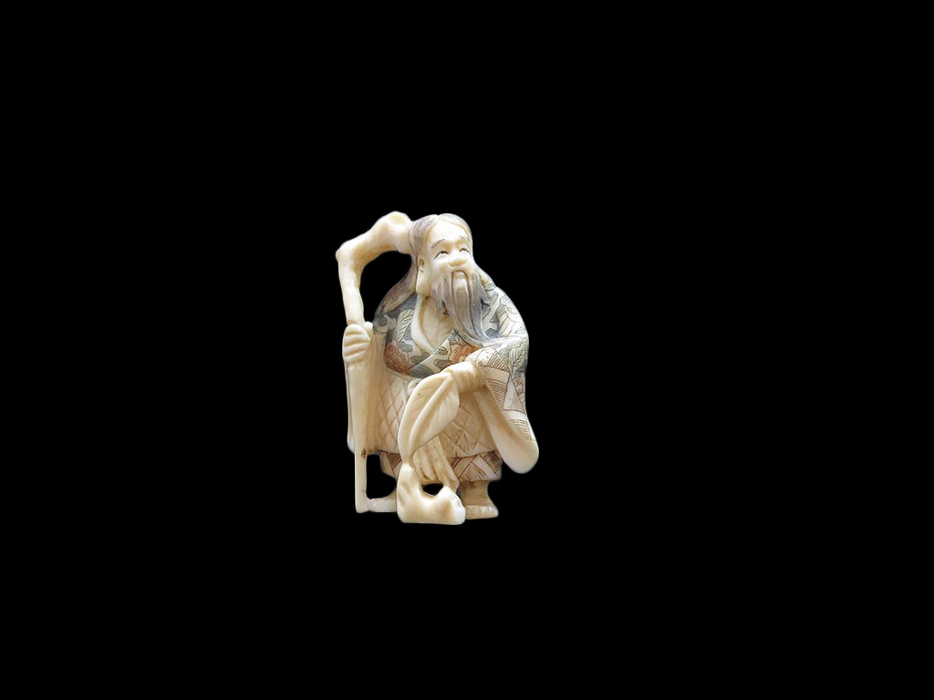 Rappresentazione di un anziano eremita con bastone ed una grossa piuma. I dettagli del kimono sono ricchissimi e riportano fiori di peonie e kamon. Fattura di alto livelo, con intaglio deciso e minuziosamente adornato