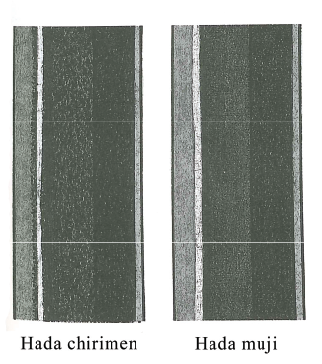 Chirimen: “Crespo”; una hada mokume ben distinguibile su metallo più chiaro rispetto ad hada simili ma di fattura più grezza. Usato soltanto per descrivere lavori della scuola Aoe.